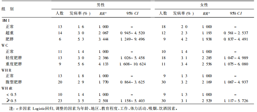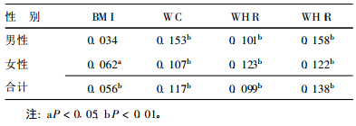 各偏相关系数(r)均调整了年龄、地区、教育程度、职业类型、体力活动、吸烟、饮酒及基线FPG值,r的强弱依次为WHtR>WC>WHR>BMI,WHtR较其他3个指标与FPG的关联更为紧密。按性别分层,男性WC和WHtR的r值较高;女性WHR和WHtR的r值较高。