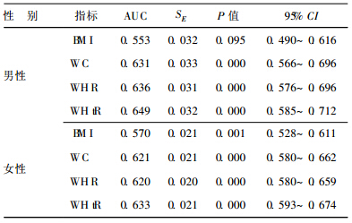 研究证实,腹部肥胖比全身肥胖的危害较大,且WC较WHR能更好的反映腹部肥胖与T2DM的危险性关系。但BMI、WC和WHR3个肥胖指标均存在一定的局限性,如BMI对腹部肥胖诊断欠缺,计算也较复杂;WC和WHR存在性别差异。WC虽可较好反映腹部脂肪蓄积状况;但不同身高的人群其WC正常范围也存在差异。近年来研究〔9, 10, 11, 12〕发现,WHtR排除了身高的影响,作为腹型肥胖指标预测T2DM的效果要优于WC。WHtR既保留了WC的特征,又无须像WC、WHR分别界定男女人群诊断切点,不同研究〔9, 12〕一致主张以0.5作为WHtR正常值切点。本研究ROC曲线下面积以WHtR最大,提示WHtR可能是与腹部肥胖相关的T2DM重要预测指标;有助于对T2DM进行早期筛检和干预。
