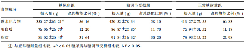 糖尿病与糖调节受损组三大生热营养素占总热能的比例较合理,但脂肪的摄入较高,超过推荐供能比。糖调节受损组三大生热营养素的摄入量均高于糖尿病组,蛋白质、脂肪摄入量高于正常糖耐量组,差异均有统计学意义(P<0.05);糖尿病组碳水化合物的摄入量明显低于正常糖耐量组,差异有统计学意义(P<0.05)。
