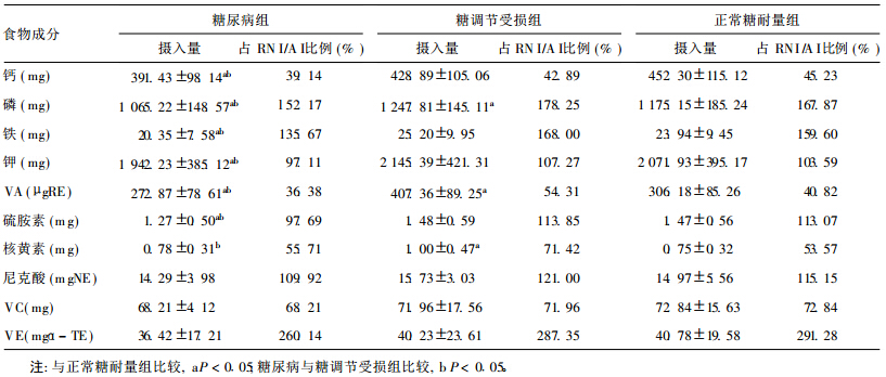 糖调节受损组维生素、矿物质的摄入量均高于糖尿病组;钙、磷、铁、钾、VA、硫胺素的摄入量在糖尿病组与糖调节受损、止常糖耐量组之间差异有统计学意义(P<0.05)。糖调节受损组的磷、VA、核黄素的摄入量高于正常糖耐量组,差异有统计学意义(P<0.05)。每日膳食中维生素、矿物质摄入量占适宜摄入量(AI)/推荐摄入量(RNI)的百分比低于90%的有钙、VA、核黄素、VC;超过RNI/AI的有磷、铁、尼克酸、VE。