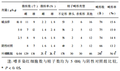 2 结 果 2.1 微核、精子畸形和染色体畸变试验结果 (表 1)| 表 1 人工蛹虫草子实体醇提物小鼠遗传及生殖毒性实验结果 |