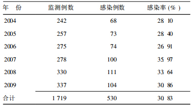 2004-2009年该院综合ICU共收治患者1719例,其中发生医院感染530例,医院感染发生率为30.83%;2007年感染发生率最高,为35.97%;2006年最低,为26.91%。