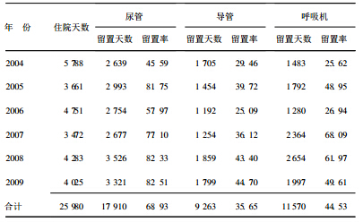1719例患者中,住院天数共计25980d,其中尿管留置率68.93%;动静脉导管留置率为35.65%;呼吸机留置率为44.53%。