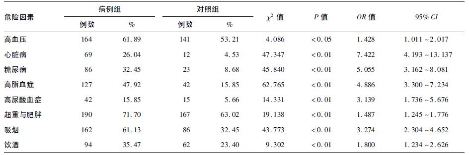 2 结果 2.1 基本情况病例组265例,男性196例,占73.96%,女性69例,占26.04%,平均年龄(56.56±12.637)岁,均为汉族;对照组男性178人,占67.17%,女性87例,占32.83%,平均年龄(54.70±10.947)岁,汉族263人,其他民族2人。2组性别、年龄、种族等构成差异均无统计学意义(P>0.05),具有可比性。