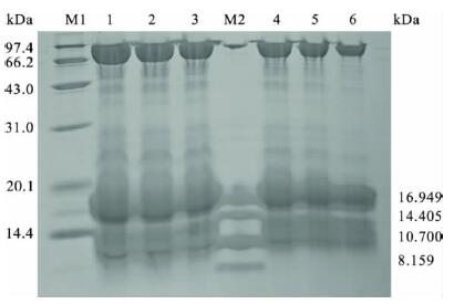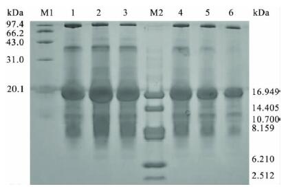 2.2 家蝇幼早淋巴方法2分析结果( 图 2)![]() | 注:M1:蛋白质分子量标准;M2:肽类分子量标准;1~6:家蝇幼虫血淋巴(上样量分别为60,50,40,30,20,10μg)。图 2 家蝇幼虫血淋巴方法2Tricine-SDS-PAGE 分析 |