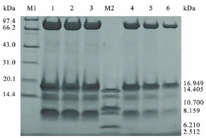 2.3 家蝇幼虫血淋巴方法3分析结果(图 3)![]() | 注:M1:蛋白质分子量标准;M2:肽类分子量标准;1~6:家蝇幼虫血淋巴(上样量分别为60,50,40,30,20,10μg)。图 3 家蝇幼虫血淋巴方法3Tricine-SDS-PAGE 分析 |