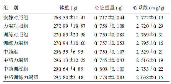 2 结 果 2.1 各组大鼠的心脏系数及体重变化(表 1)| 表 1 补肾益气中药及运动训练对大鼠体重及 心系数的影响(n = 8, x ± s) |