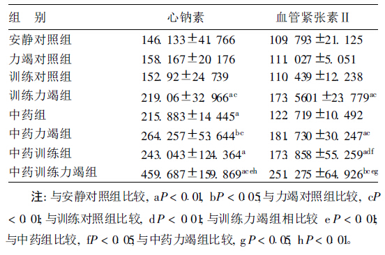 与安静对照组比较,中药组和中药训练组ANP和AngⅡ含量明显升高,差异有统计学意义(P < 0.01);与力竭对照组比较,训练力竭组、中药力竭组和中药训练力竭组ANP和AngⅡ含量明显升高(P < 0.01);训练力竭组与中药训练力竭组ANP和AngⅡ含量明显高于训练对照与中药训练组,差异具有统计学意义(P < 0.01)。