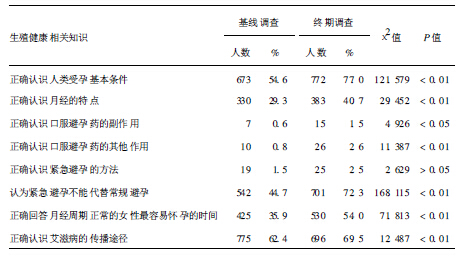 随着知识的增长一些错误的态度也会随之改变。本研究中干预后男生女生对人工流产、贞操、未婚怀孕的态度都更为谨慎。干预使更多的大学生意识到人工流产会对女性生理和心理造成较大影响。但是行为的改变一般比较困难,除了知识外,个人的人生观和价值观、社会环境等均会对其产生影响。尤其短期内要使行为改变并不容易。因此,不同于以禁欲为主的干预方法,通过生殖健康教育干预减少意外妊娠发生率,提倡安全性行为显得更为重要。在本研究中发生性行为的人数减少,发生性行为时每次都采取了避孕措施的人数明显增加,说明更多的大学生认识到了避孕的重要性;大多数的大学生采用了人工流产的方式来终止妊娠,只有小部分的人通过药物流产来终止妊娠。通过干预,大学生减少了不安全性行为的发生。要改善青少年整体的生殖健康状况,应该有足够的时间保证家庭、社会和学校联合干预。