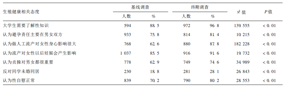 干预前后大学生对生殖健康相关态度的7项指标均有明显提高 (P < 0.01)。