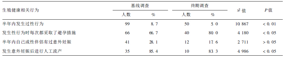 2 结 果 2.1 基本情况基线调查1 232人,其中男生517人,占 42.0%,女生715人,占58.0%;年龄为15.7~23.2岁,平均年龄为19.6岁;有恋人人数占65.5%。终期调查1 008人,其中男生430人,占43.1%,女生568人,占56.9%;年龄为 16.7~24.2岁,平均年龄为21.1岁,有恋人人数占51.0%。