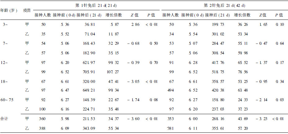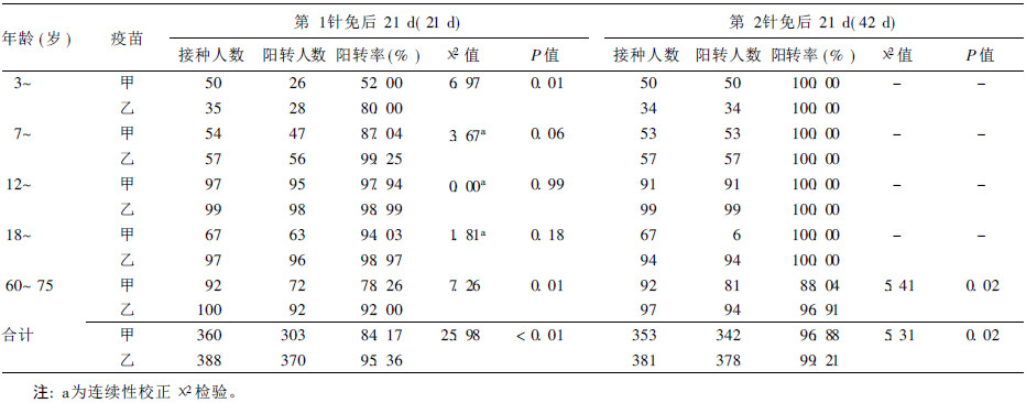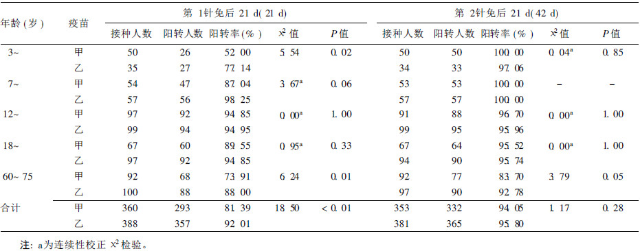 2.2 2种疫苗免疫原性比较 2.2.1 抗体阳转率比较(表 1)表 1可见,第1针接种后42 d时,各组抗体阳转率均高于21 d时的抗体阳转率。第1针接种后21 d时,3岁~和60~75岁组的乙疫苗抗体阳转率均明显高于甲疫苗抗体阳转率(P < 0.05);42 d时各组2种疫苗的抗体阳转率差异均无统计学意义(P > 0.05)。
