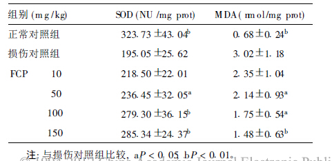 损伤对照组与正常对照组比较,睾丸组织中 SOD 活性下降,M DA 含量上升,差异有统计学意义 (P < 0.01); FCP能提高大鼠睾丸组织中 SOD 活性,降低 MDA 含量,除 FCP 10 m g组其余 FCP 各组与损伤对照组比较,差异有统计学意义 (P < 0.01 或 P < 0.05) 。