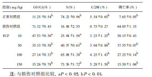 损伤对照组的 G0 /G1期细胞数量明显高于正常对照组,说明高温使细胞生长阻滞在G0 /G1期。 FCP 实验各组与损伤对照组比较,S 和 G2 /M 期的细胞明显增多,而 G0 /G1期细胞数目减少,差异有统计学意义 ( P < 0.01或 P < 0.05),即 FCP 有效调节了生殖细胞的生长周期,促进生殖细胞的正常生长。