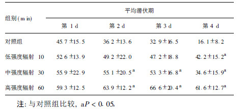除高强度辐射组外,其他各组平均潜伏期呈下降趋势,第2、3d高、中强度辐射组平均潜伏期与对照组比较差异有统计学意义( P < 0. 05)。