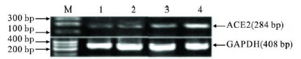 2.2 低氧对大鼠心脏右心室ACE2 mRNA 表达影响(图 1)![]() | 注: M: 标准; 1: 对照组; 2: 缺氧1 d; 3: 缺氧3 d; 4: 缺氧30 d。 图 1 右心室心肌组织ACE2 mRNA电泳图 |