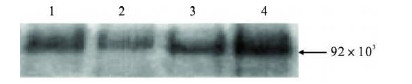 2.3 低氧对心脏右心室ACE2 蛋白水平表达影响( 图 2)![]() | 注: 1: 对照组; 2: 缺氧1 d; 3: 缺氧3 d; 4: 缺氧30 d。 图 2 W estern blo t检测右心室心肌组织ACE2 蛋白表达 |
