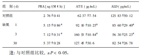 结果显示,随着缺氧时间延长,血浆PRA,AT 的含量呈上升态势,ALD 含量逐渐下降(P < 0 .05)。