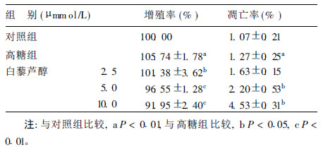 以对照组增殖率为100%,则高糖组增殖率为(105.74±1.78)%,较对照组增殖率增高(P < 0.01)。白藜芦醇处理后3组增殖率均较高糖组明显减低(P < 0.05或P < 0.001)。白藜芦醇处理后凋亡率逐渐增高,其中5、10 μmmol/L组凋亡率较高糖组明显增加(P < 0.01)。