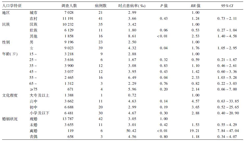 本次调查重性抑郁症时点患病率为3.40‰,标化率为3.01‰; 女性重性抑郁症时点患病率高于男性(P < 0.05) ; 其他民族居民时点患病率高于汉族和壮族(P < 0.01) ; 时点患病率的患病年龄高峰集中在55 ~ 64 岁(P < 0.05) ; 离婚居民时点患病率较高 (P < 0.01) ; 不同地区和不同文化程度居民时点患病率差异均无统计学意义(P < 0.05) 。