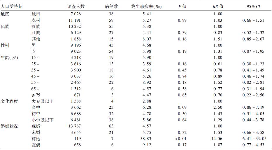 本次调查重性抑郁症终生患病率为5.32‰,标化率为4.87‰; 离婚人群终生患病率较高(P < 0.05) ; 不同地区、民族、性别、年龄和文化程度居民终生患病率间差异均无统计学意义(P < 0.05) 。