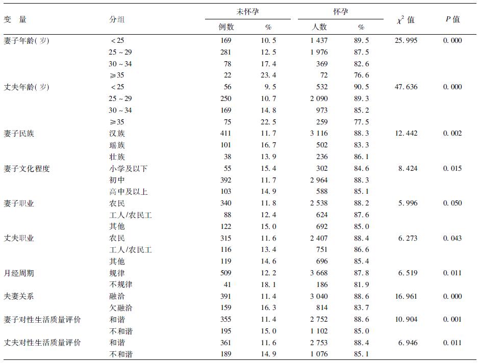 1.3 统计分析资料在EpiData 3.0 数据库中2次录入,采用SPSS 13.0 软件进行相关逻辑检查及分析。采用一般统计描述分析、χ2 检验比较各因素亚组的怀孕情况。
