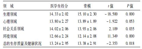 2 结 果 2.1 医学生生存质量状况(表 1)| 表 1 医学生生存质量得分与常模比较(x±s) |