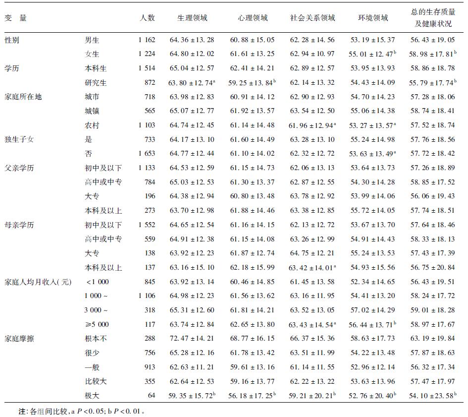 不同学历和家庭摩擦状况医学院校学生生理领域得分间差异均有统计学意义(P < 0.05) ; 不同学历和家庭摩擦状况医学院校学生心理领域得分间差异均有统计学意义(P < 0.01) ; 不同家庭所在地、母亲学历、家庭人均月收入和家庭摩擦状况医学生社会关系领域得分间差异均有统计学意义 (P < 0.05) ; 不同性别、家庭所在地、家庭人均月收入、家庭摩擦状况和是否为独生子女医学生环境领域得分间差异均有统计学意义(P < 0.05) ; 不同性别、学历和家庭摩擦状况医学生总的生存质量及健康状况得分间差异均有统计学意义 (P < 0.01) 。