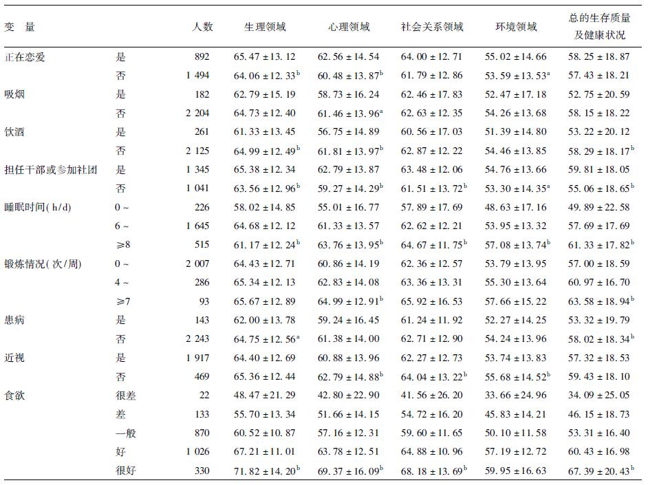 不同睡眠时间、食欲状况及正在恋爱、饮酒、担任干部或参加社团、患病医学院校学生生理领域得分间差异均有统计学意义(P < 0.05) ; 不同睡眠时间、锻炼次数、食欲状况及正在恋爱、吸烟、饮酒、担任干部或参加社团、近视医学院校学生心理领域得分间差异均有统计学意义(P < 0.05) ; 不同睡眠时间、食欲状况及担任干部或参加社团、近视医学院校学生社会关系领域得分间差异均有统计学意义(P < 0.01) ; 不同睡眠时间及正在恋爱、担任干部或参加社团、近视医学院校学生环境领域得分间差异均有统计学意义(P < 0.05) ; 不同睡眠时间、锻炼次数、食欲状况及是否饮酒、担任干部或参加社团、患病医学生总的生存质量及健康状况得分间差异均有统计学意义(P < 0.01) 。