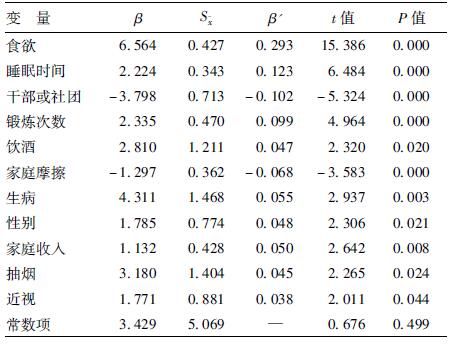 以总的生存质量及健康状况为因变量,以性别、层次、家庭所在地、独生子女、母亲学历、人均月收入、家庭摩擦、正在恋爱、 吸烟、饮酒、担任干部或参加社团、睡眠时间、锻炼次数、生病、 近视、食欲共16 个因素作自变量进行多元线性逐步回归分析。结果表明,女生、食欲好、睡眠时间长、锻炼次数多、家庭人均月收入多、不吸烟和饮酒、未患病和非近视的医学生的生存质量较高; 未担任干部或参加社团和经常发生家庭摩擦的医学生的生存质量较低。
