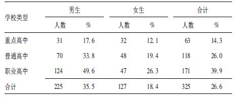 1 对象与方法 1.1 对象采取方便抽样方法,选取北京市某区重点高中、普通高中和职业高中各1所,先按年级分层,在每个年级中按比例随机选取文科班级和理科班级(职业高中在每个年级随机选取不同班级)全班同学为调查对象。共发放问卷1366份,有效问卷1325份,有效率97.0%。其中男生633名,占47.8%,女生692名,占52.2%;年龄14~20岁,平均年龄为16.6岁。