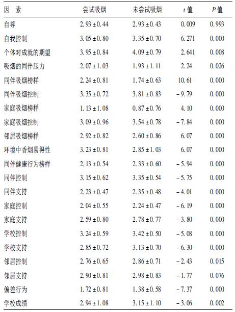除自尊和邻居支持以外,不同尝试吸烟状况的高中生各个社会心理因素得分比较,差异均有统计学意义(P<0.05或P<0.01)。