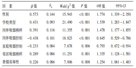 1.3 统计分析采用Epidata3.1录入数据,应用SPSS 13.0软件进行统计分析;结果比较分别采用χ2检验,t检验;应用非条件Logistic回归分析进行高中生尝试吸烟行为影响因素分析,采用基于偏最大似然估计的后退法,性别以女生为参照组,学校类型以重点高中为参照组,P>0.10为剔除变量的标准。