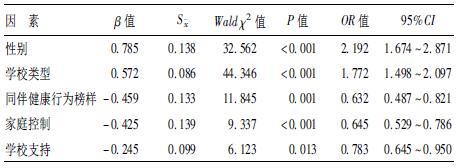 将泛化的环境感知系统、性别及学校类型同时引入Logistic 回 归方程,控制性别及学校类型后,同伴健康行为榜样、高家庭 控制、高学校支持是降低高中生尝试吸烟行为的保护因素,其 余变量则无法解释尝试吸烟行为。