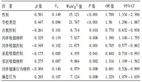 将三大系统所有社会心理因素变量、性别及学校类型同时引入Logistic回归方程,控制性别及学校类型后,高自我控制、同伴健康行为榜样、来自同伴和家庭的高吸烟控制是降低高中生尝试吸烟行为的保护因素,来自同伴和邻居的吸烟榜样以及高偏差行为是增加高中生尝试吸烟行为的危险因素。
