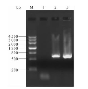 ![]() | 注: M: DNA Maker I; 1: 空白对照; 2: Z23; 3: YD。 图 1 marOR基因PCR扩增结果(604 bp) |