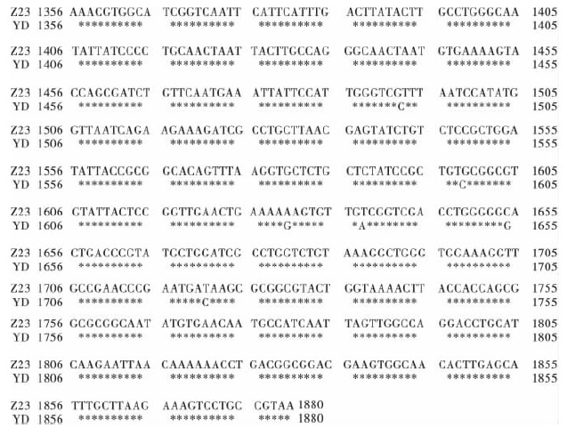 2.3 核酸序列分析结果(图 2)![]() | 注: * YD株与Z23株碱基相同。 图 2 志贺菌Z23株与YD株marOR基因碱基位点比较 |