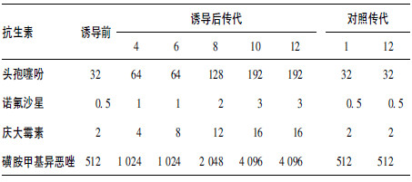 | 表 4 4种抗生素诱导志贺菌敏感株耐多药前后MIC(μg /mL)比较 |