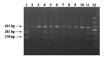 2.2 p22phox基因 C242T扩增产物图谱 (图 1)![]() | 注: 1:为 TT纯合子 ; 4,5,7,11:为 TC杂合子 ; 2,3,6,8,9,10:为 CC纯合子 ; 12: DNA Marker。 图 1 p22phox基因 C242T突变区 PCR扩增 产物 Rsa I酶切电泳结果 |