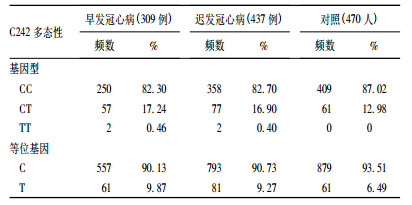 3组的基因型分布均符合 Hardy-Winberg平衡定律。表 1可见,早发冠心病组、迟发冠心病组 p22phox基因 C242T突变基因型分布和等位基因频率的差异均有统计学意义 ( P早发基因型 = 0.023,P早发等位基因 = 0.016; P迟发基因型 = 0.048,P迟发等位基因 = 0.029)。早发冠心病组与迟发冠心病组比较差异均无统计学意义 ( P基因型 = 0.899和 P等位基因 = 0.721)。