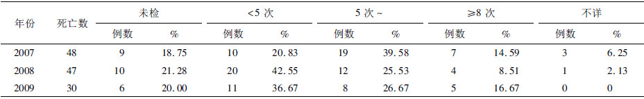 2.5 死亡孕产妇孕期保健情况(表 3)| 表 3 死亡孕产妇孕检次数及构成比 |