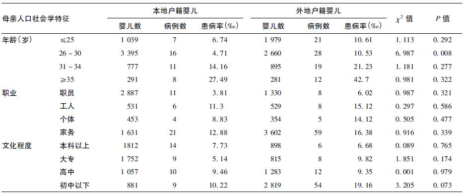婴儿CHD患病率与母亲的社会人口学因素有关,在本地户籍婴儿中,母亲年龄≥35岁、职业为家务者CHD患病率高于其他各年龄及职业组,差异有统计学意义(χ2=22.558,χ2= 12.104,P < 0.01),但与母亲的文化程度关系差异无统计学意义(χ2=3.301,P > 0.05);在外地户籍婴儿中,母亲年龄≥ 35岁、初中及以下文化程度、职业为家务者婴儿CHD患病率高于其他各组,差异有统计学意义(χ2=24.423,χ2=12.212,P < 0.01,χ2=8.141,P < 0.05)。比较本地户籍与外地户籍母亲社会人口学特征与婴儿CHD患病率关系,发现外地户籍母亲生育年龄26~30岁组婴儿患病率高于本地户籍母亲同年龄组,差异有统计学意义(χ2=6.987,P < 0.01)。