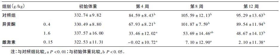 2 结 果 2.1 大豆异黄酮对去势大鼠体重影响(表 1)| 表 1 大豆异黄酮和雌激素对大鼠体重增长影响( g,x±s,n = 7) |