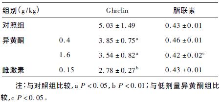 与对照组比较,大豆异黄酮和雌激素组去势大鼠血清ghrelin水平明显降低 (F=6.069,P < 0.05),各组大鼠血清脂联素水平未见明显变化(F=3.333,P > 0.05)。
