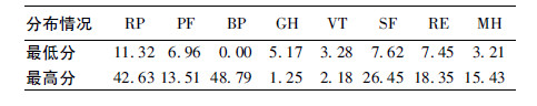 2.2 内部一致性信度RP、PF、BP、GH、VT、SF、RE、 MH 8 个维度的Cronbach's α 系数分别为0.79、0.88、 0.86、0.81、0.77、0.76、0.88、0.77(均P <0.01) 。