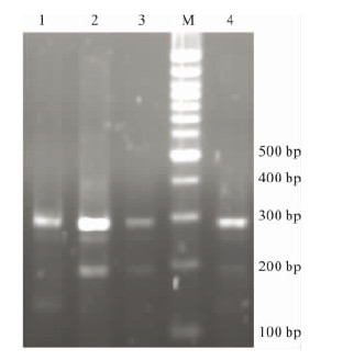 2 结 果 2.1 基因型分析(图 1)![]() | 注: 1: GG 纯合子型; 2、3: CC 纯合子型; 4: CG 杂合子型; M: DNA Marker。 图 1 广西壮族人群CYP1B1 Leu 432 Va1 PCR 扩增产物 |