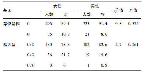 2.3 不同性别CYP1B1 Leu 432 Va1 等位基因分布频率和基因型比较(表 1)| 表 1 广西不同性别壮族人群CYP1B1 Leu 432 Va1 等位基因和基因型比较 |