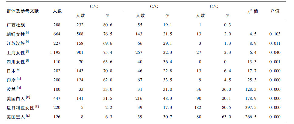 广西壮族人群CYP1B1 Leu 432 Va1 基因型分布频率(包括男、女性人群) 与朝鲜人群比较,差异无统计学意义(χ2 = 4.5,P > 0.05) ,但与国内江苏汉族、上海和四川女性比较,差异有统计学意义(χ2 = 8.9、6.4、13.3,P < 0.05) ,与日本、印度、波兰、尼日利亚、美国白人和美国黑人人群比较,差异有统计学意义(χ2 = 17.7 ~ 397.5,P < 0.01) 。表明广西壮族人群CYP1B1 密码子432 基因型分布频率与其他种族存在差异。