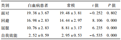 | 表 1 白血病患者应对方式及自我效能得分比较( 分, x ± s) |