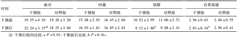 1.2 方法 1.2.1 问卷调查与心理测评符合入选标准的患者签署知情同意书后,对照组患者给予常规护理,认知干预组在常规护理的基础上进行认知心理干预; 2组患者干预前后分别采用一般调查问卷、医学应对问卷、一般自我效能感量表进行调查和测评。 (1)问卷调查:根据研究目的自行设计一般问卷调查表,内容包括性别、年龄、职业、受教育程度、婚姻状况、经济状况等以及疾病分型、化疗阶段、病程等。(2)采用医学应对问卷 (Medical Coping Modes Questionnaire,MCMQ) [2]进行应对方式测评。该问卷包括面对、回避、屈服等 3个维度 20个条目,各条目按1~4级评分,各维度得分由相应条目分累计所得,得分越高表明患者越倾向于该应对方式。中文版 MCMQ具有较好的信度和效度。(3)采用一般自我效能感量表 (General Self-Efficacy Scale,GSES) [3]进行自我效能测评。该量表共 10个条目,涉及个体遇到挫折或困难时的自信心,采用 1~4级评分,得分越高,自我效能水平越高。该量表的内部一致性系数 α为 0.87,重测信度为 0.83,分半信度为 0.82。